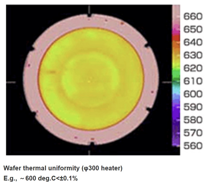 在使用等離子體增強化學氣相沉積(PECVD)設備制備薄膜時,成膜均勻性和膜厚的主要影響因素是等離子體特性和工藝溫度。首先,等離子體的密度和分布直接影響薄膜的均勻性和沉積速率。均勻分布的等離子體可以確保活性氣體在襯底表面充分反應,從而形成均勻的薄膜?。而等離子體能否均勻分布與嵌入加熱器中的射頻網(RF Mesh)密切相關。其次,特定的工藝溫度保證出色的熱均勻性。陶瓷加熱器確保晶圓表面溫度在±1.0% 以內波動。比如日本礙子(NGK insulator) 生產的加熱器溫度波動小于 0.1%,屬于優異指標。